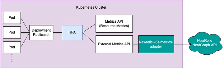 Newrelic is a powerful monitoring tool. And Newrelic provides the New Relic Metrics Adapter. The New Relic Metrics Adapter registers various metrics provided by Newrelic as Kubernetes Metrics.