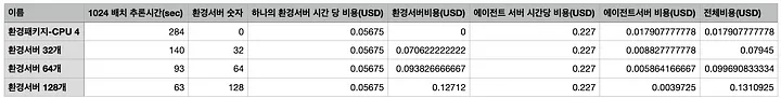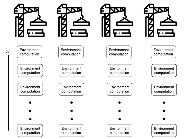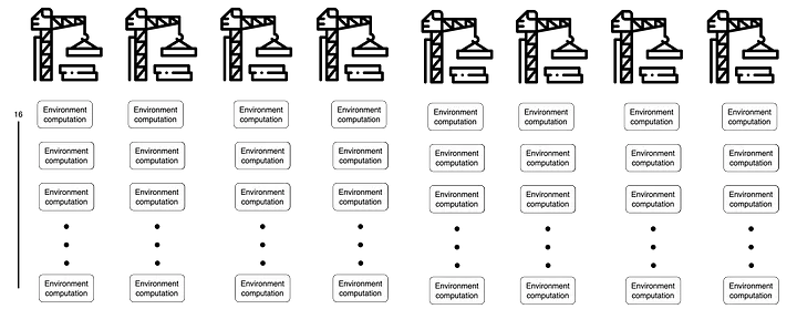 On the other hand, with $8$ cores, $128$ environment operations are processed 8 at a time, meaning that after $128 / 8 = 16$ environment operations, all $128$ operations will be completed. Therefore, compared to the $4$-core case, we can expect the environment computation time to be approximately twice as fast.